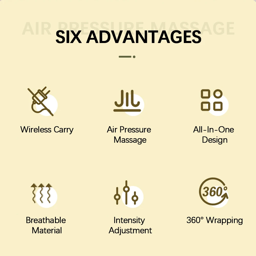 2. Projeto progressivo da massagem da pressão do ar, airbags longos dobro da coluna, 360 ° nenhum ângulo inoperante em torno da panturrilha, massagem e relaxa os músculos da panturrilha.